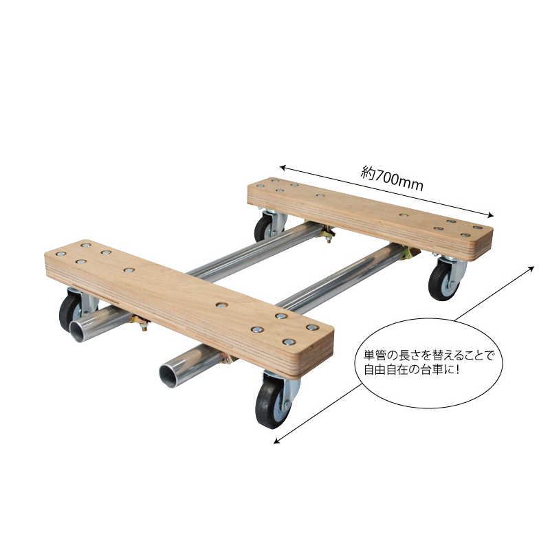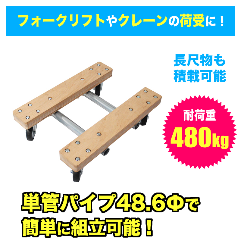 | 備考 | 現場足場管(丸管・丸パイプ・鋼管)として足場組立に使用される単管パイプの48.6Φで簡単に組立する事が出来るお薦めの台車です。 組立台車なので倉庫のスペースも省スペースで保管する事が出来ます。 スチール製の台車の積載面と比較すると積載物が滑りにくいので、安心して運搬出来ます。キャスターの交換も可能なので、長期に渡ってご使用頂けるタイプの台車です。 ※組立用の単管パイプは付属しておりません |